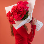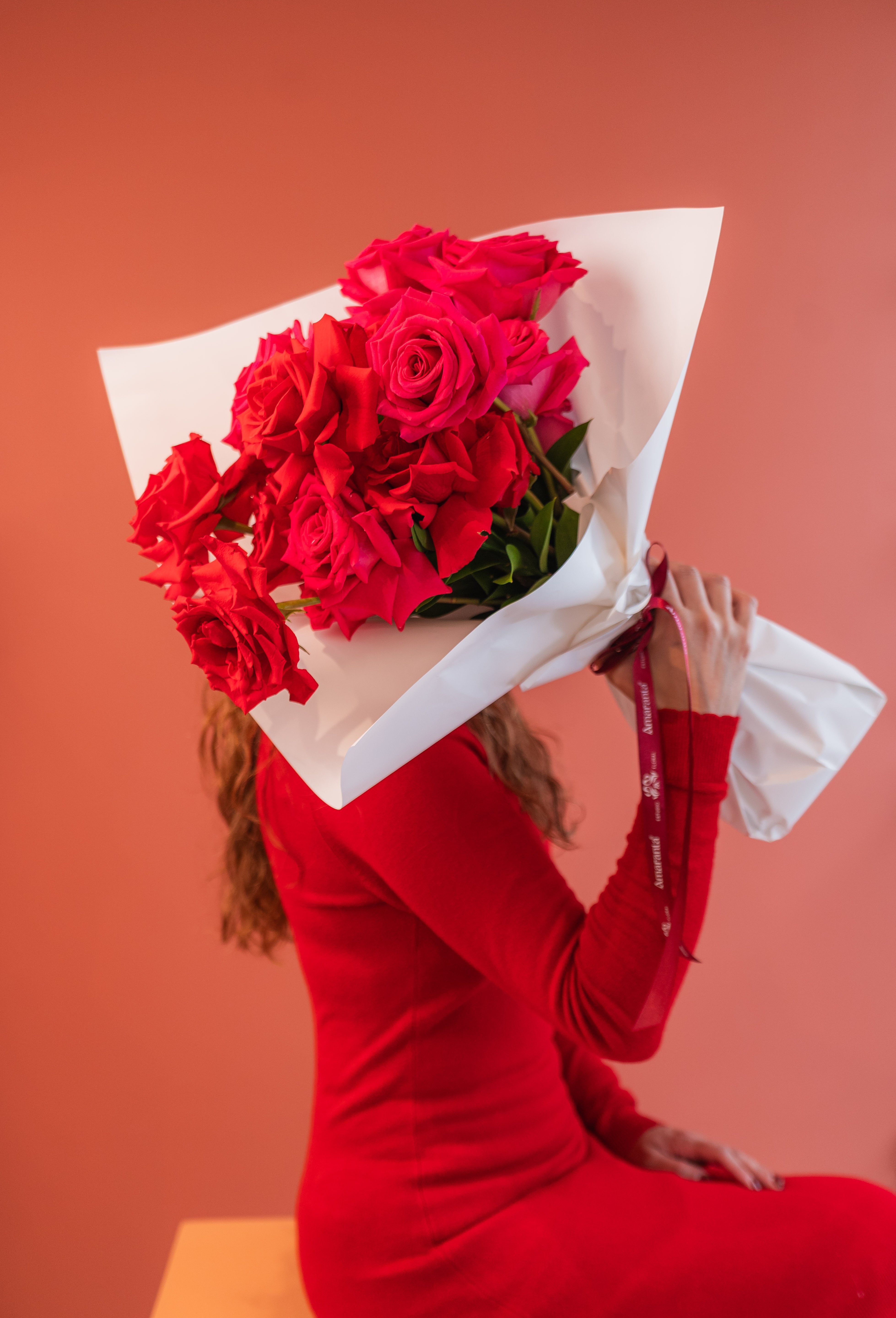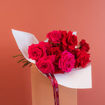 – Arreglo floral de rosas frescas en paleta de rojos y rosados.