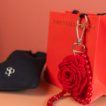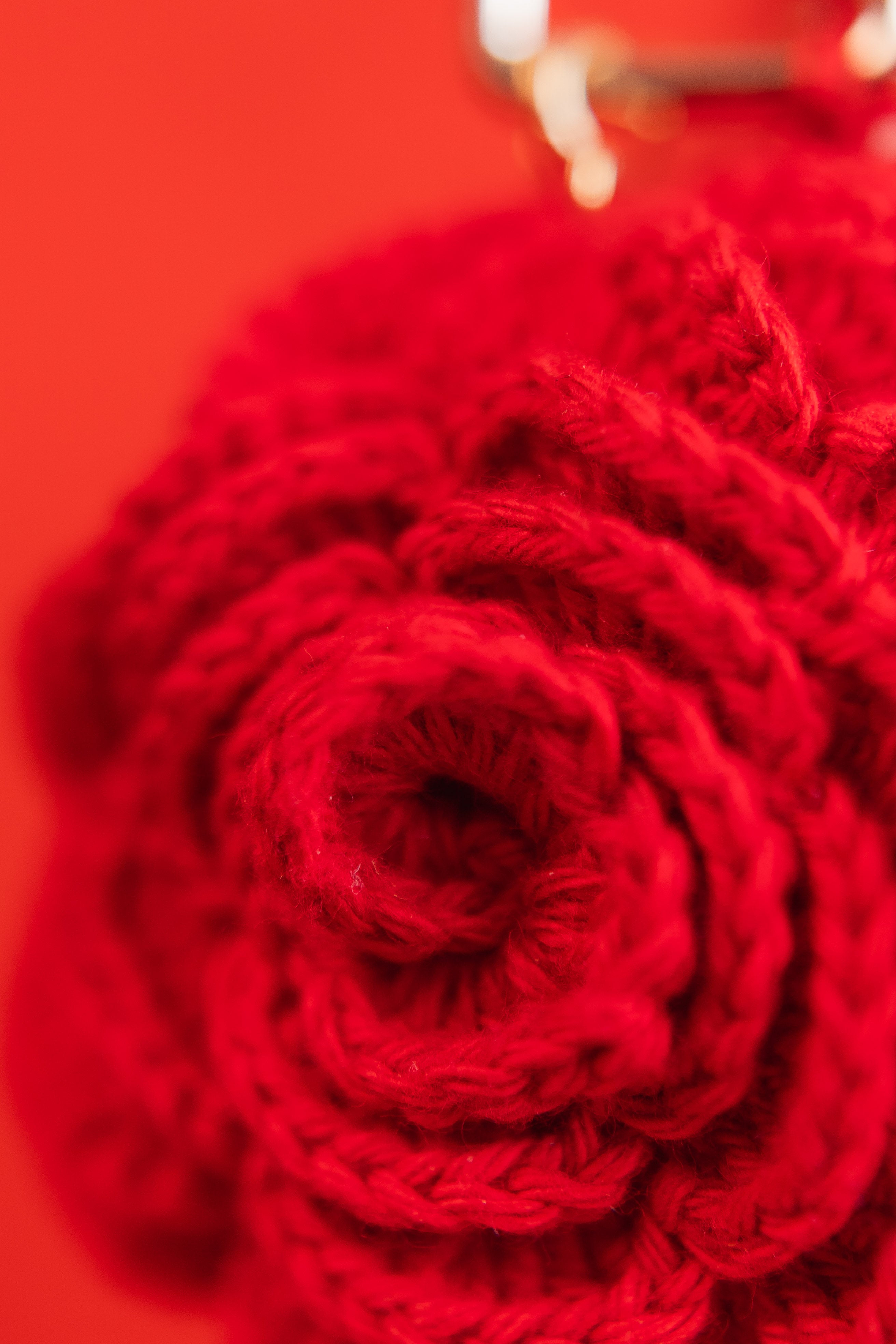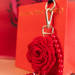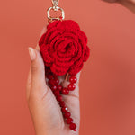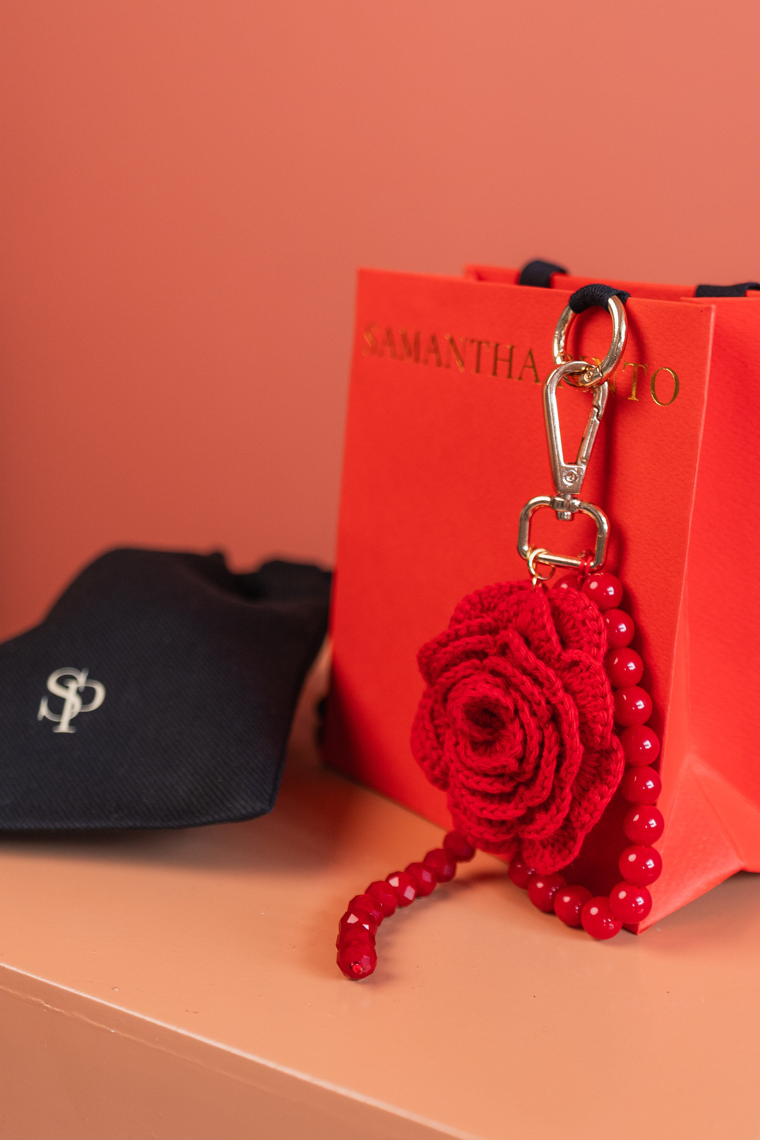 – Bag charm statement tejido a mano, con flor construida punto por punto y cuentas ensambladas manualmente.